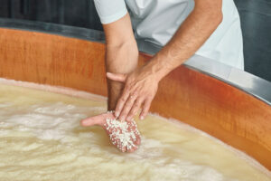 När uppvärmningstemperaturen har uppnåtts och granulerna är lika stora som vetekorn, tar ostmakaren en handfull korn och knådar dem försiktigt till en massa för att kontrollera texturen.