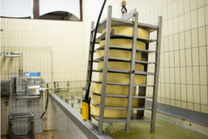 Följande dag tar ostmakaren ut varje hjul ur formen och placerar dem i ett 22 % koncentrerat saltbad, även kallat saltlake, i 24 timmar. Sedan börjar mogningen. Hjulen lagras i tre månader i ostmakarens källare. Han sköter dem nästan dagligen för att underlätta bildandet av ett fint skyddande skal (kallat “smear” – morge).