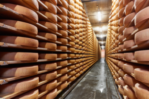 Efter tre månader lämnar hjulen ysteriet för att lagras i caves d’affinage (lagringskällare) för en långsam mogningsprocess i en miljö med 90 % luftfuktighet och en temperatur på 15° (59°F). Under denna tid vänds hjulen och penslas med saltvatten. Källarna avger en typisk lukt av ammoniak, ett resultat av hjulens mognad. Affinaget varar totalt mellan 5 och 18 månader.