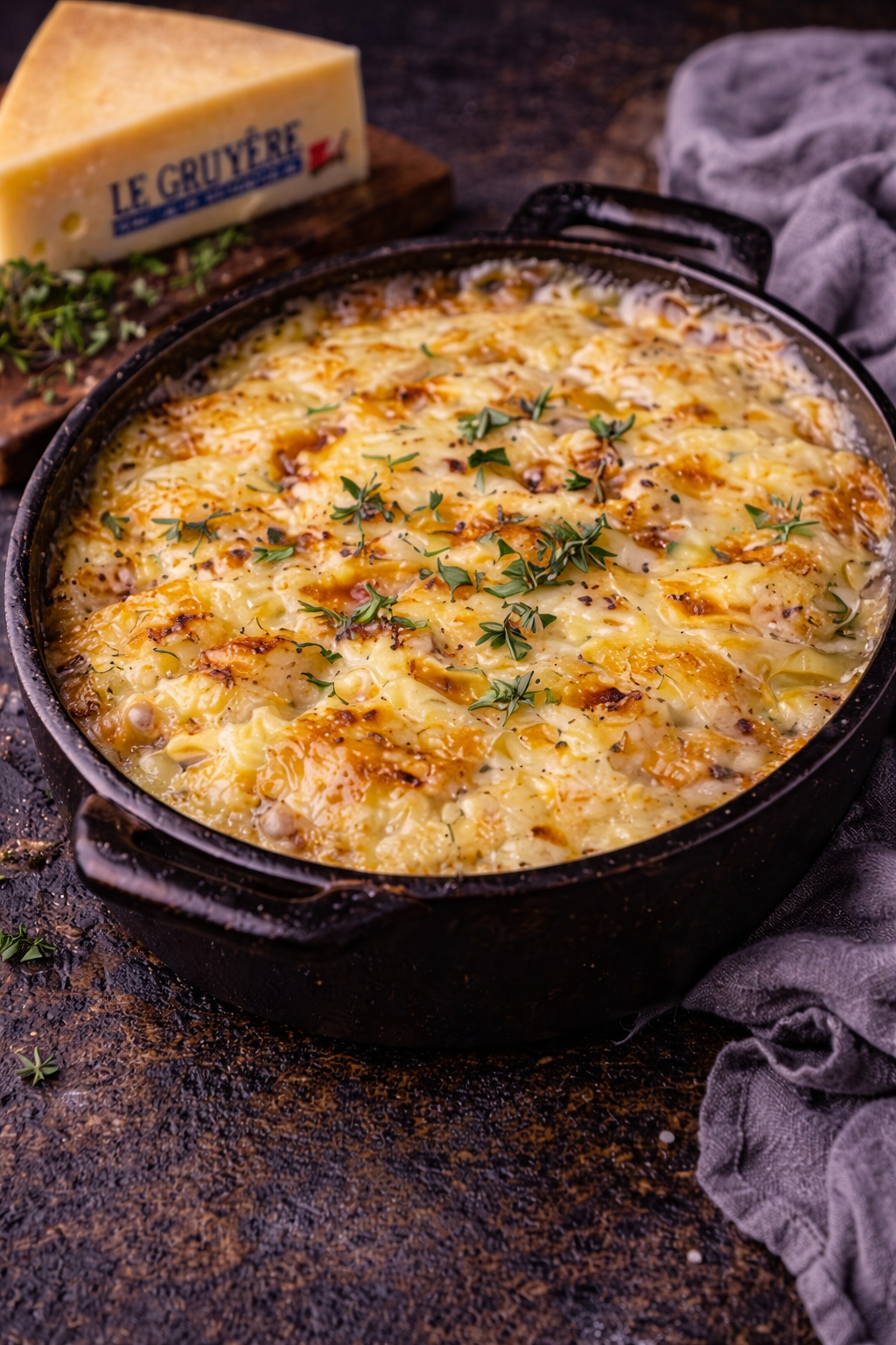 Typ av rätt: HuvudrättTillagningstid: ca 40 minuter En klassisk potatisgratäng med Le Gruyère AOP, där osten ger en djup, nötig smak och perfekt gyllene yta. Ett lyxigt tillbehör till kött, kyckling eller vegetariska rätter. Ingredienser: Tillagning: Serveringstips (restaurang):Låt vila 10 minuter innan servering för perfekt konsistens. Garnera med färsk timjan. …